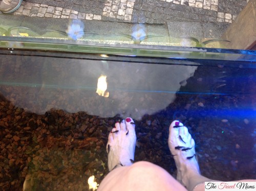 So I followed her to the window and climbed the stair to the tank in the window. She then gave me instructions on how to put my feet in the water. Apparently, the fish do not like it if you put your feet in fast. I was 2 seconds from an anxiety attack and really did not know if I could do it. I took a deep breath and put my left foot in the water, all of a sudden a swarm of fish started nibbling on my foot, in fear I snatched my foot out right away. Now I cannot say it hurt but it tickled and felt really weird. I finally put my foot back in and then went for the second foot, but the girl was not pleased she told me I had to put my feet lower. I finally agreed, but when she insisted I put my feet in as far as my knees – that was not happening.