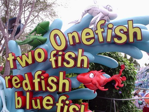 The ride is slow, but the fact that you can get a “high in the sky” view of the whole park, makes up for the speed. The Cat in the Hat ride is fun, but there are a lot of fast spins that may not be appropriate if you have a weak stomach. Although, we rode the Cat in the Hat, like four times in a row with our two boys because they love it so much, from the books, to the cartoons, to the Mike Myers movie. The One Fish, Two Fish, Red Fish, Blue Fish ride is fun, it gives you a little cooling off with random water squirts and kind of reminds me of the Dumbo ride at Disney, but squirting water adds so much more