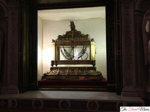 To the left above is the exhibition of St. Peter’s chains – these very same chains that are said to have held Peter as a captive. There are actually two sets of chains that legend says were once the chains that held Peter – when they were put together they linked miraculously. The first set of chains is from when Peter was held in Mamertine prison in Rome. The second set of chains held Peter during Herod’s rule in Jerusalem.